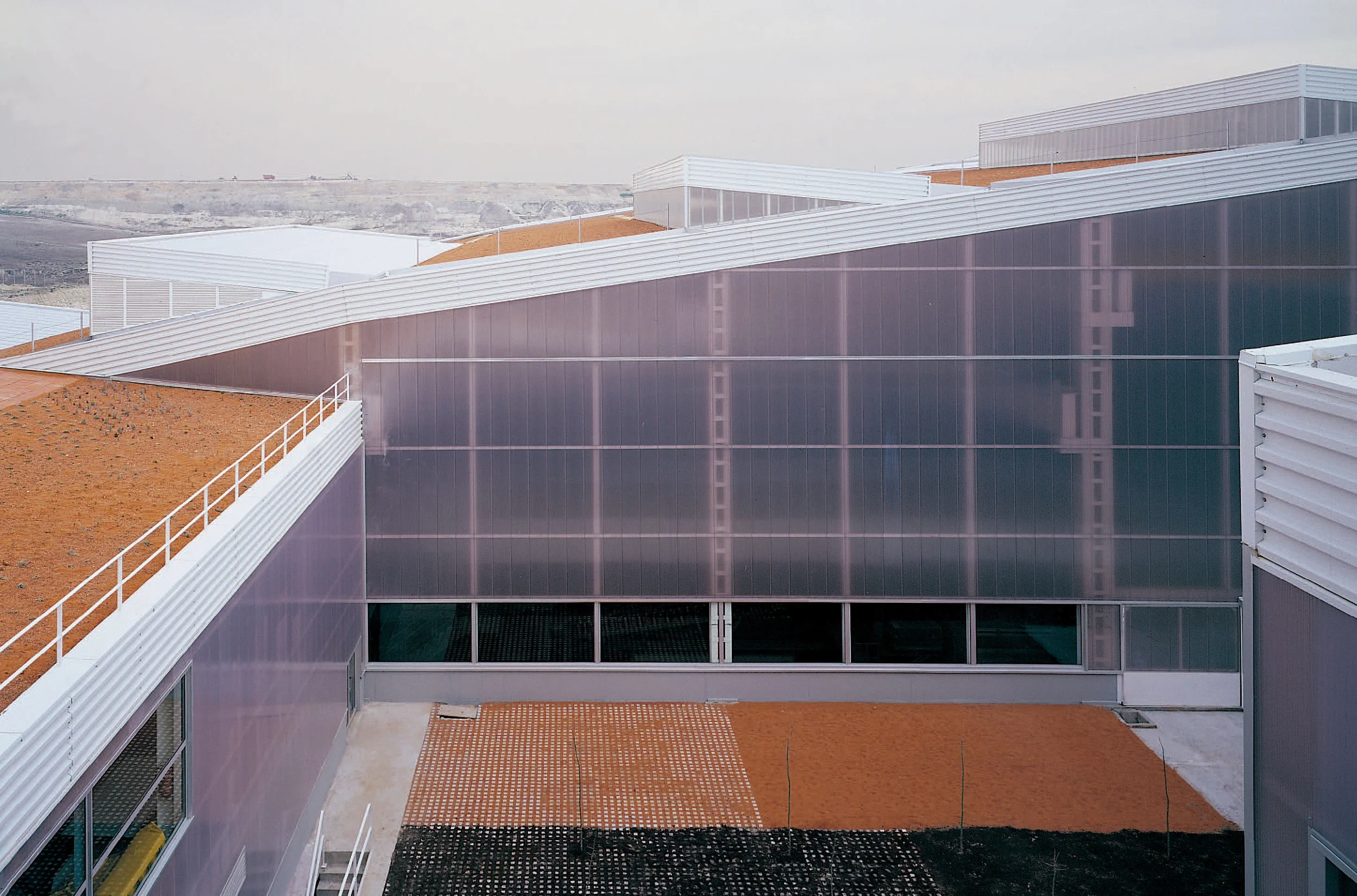 JUAN: The mission was to create a recycling plant for Madrid’s domestic garbage, and also to organize a new landfill. We put all the little industrial buildings together in a simple volume, a square building that was placed in the slope of the hill — the recycling system is gravitational, so we wanted the building to replicate the industrial process. We used a green roof, and put it on columns. Then we enveloped all the industrial areas, the offices, all the rest of the spaces, with our recycled polycarbonate façade — a translucent shell.